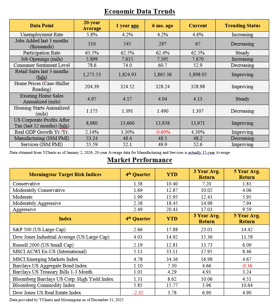We hope this update finds you and yours celebrating a wonderful 2025 and looking forward to 2026 with great hope and anticipation for all that is ahead. We are coming out of what could be one of the most eventful years on record since I began my career almost 40 years ago. It has been encouraging to see the economy and the markets maintain a remarkable and almost inexplicable level of resilience, pushing most market indices to double digit returns for the year, while at the same time doing so in ways that call for even greater thoughtfulness and intentionality as we look ahead.